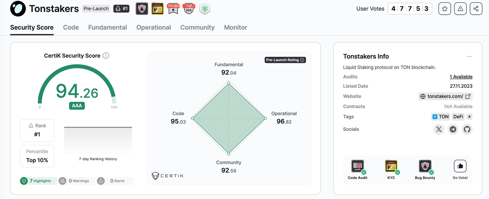 2024 年初,Tonstakers 通过了 Certik 安全公司的全面安全审计,获得了 100 分中的 94 分(AAA)。这使得 Tonstakers 成为 TON 区块链上安全性最高的项目,并且在运营期间保持了无安全事件的记录。