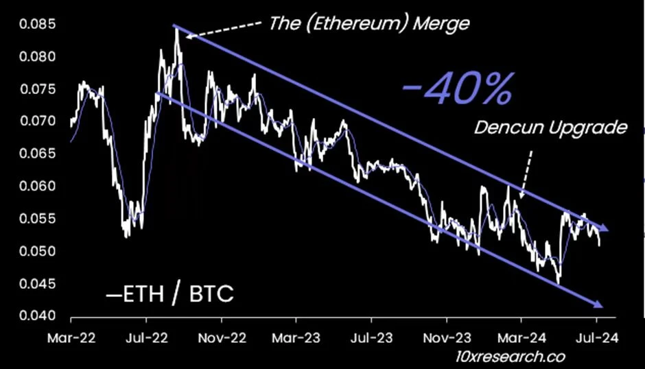 与 BTC 相比,ETH 上涨的 β 系数也在减弱。自这轮牛市开始以来,ETH 表现就一直不够理想, 如果从 2022 年 10 月开始算起,ETH 的表现要落后 BTC 40% 。