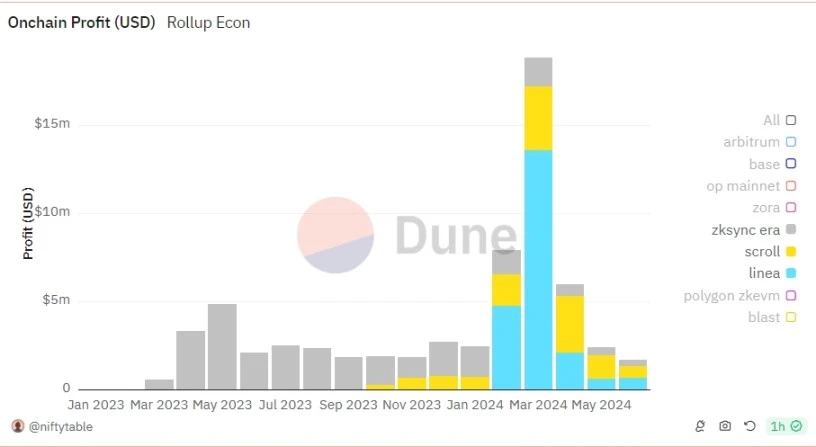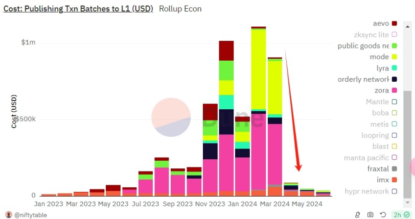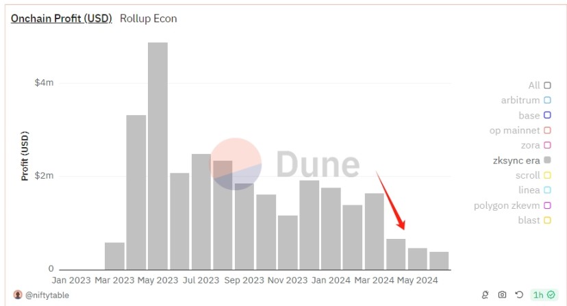 首当其冲的便是 ZkSync。坎昆升级之后,ZkSync 第一时间支持了这个新特性,但效果糟糕。Gas 费几何级降低,并没有带来预期中的用户增长和生态繁荣,反而导致 Rollup L1-L2 Gas 差价收入的腰斩。