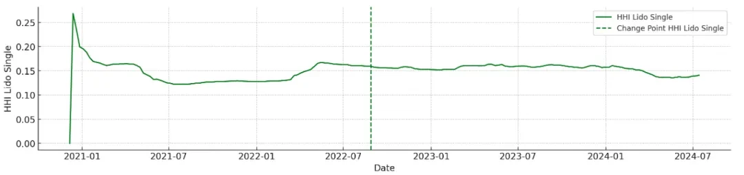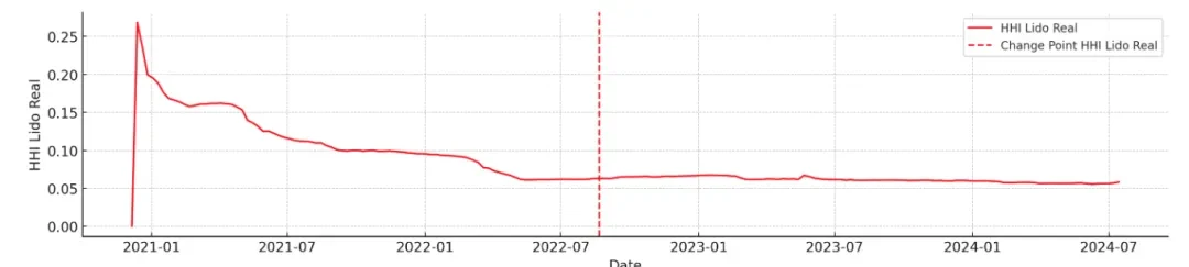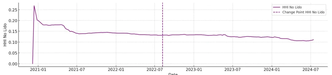 我们进一步对 HHI 指数的变化进行分析。大概在 ETH 占总量比例除此达到 11% 时,也就是 2022 年八月左右,此时供应量为 120 m,HHI 计算的去中心化增长边际效用开始明显减弱。我们认为此时发生了“质押饱和”的情况——即新增的质押量带来的去中心化改进明显减弱。