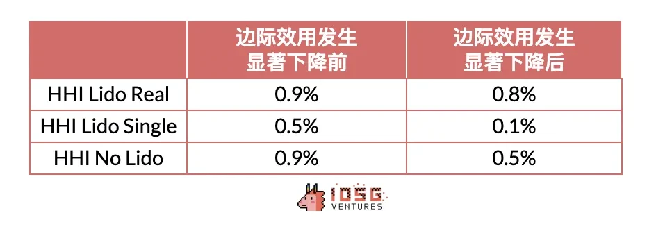 我们发现无论在哪种情况下,质押数量的增加都会对质押的去中心化程度带来正面作用,但积极进行去中心化治理的流动性质押协议带来的边际效用(0.9% )更为明显,且在质押较为饱和后(0.8% )仍发挥着较出色的边际效用。