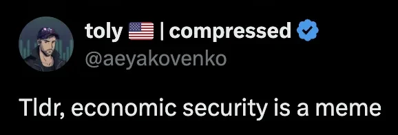 某种意义上,Toly 说 economic security 是 meme 是对的,因为以太坊目前经济安全转化率确实越来越低,其他层面的安全也够强。但这并不影响以太坊对 economic security 的需求。Economic security 作为安全组成的一部分,能够保护网络的活性,且是用户最能够直接感受到的安全形式,也最能保障以太坊的核心价值。