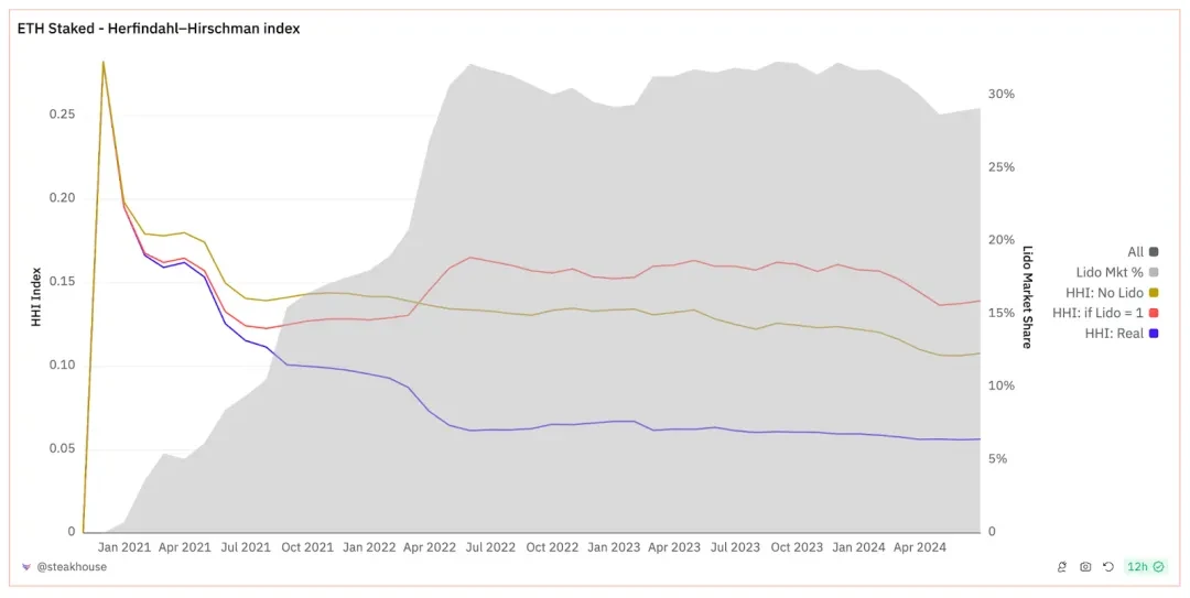 相比 CEX,流动性质押好在其通过不同的方式缓解中心化,包括对于服务商选取的 DAO 治理、双重代币治理、Lido 的 DVT 和 Rocket pool 的 Mini pool。Steakhouse 绘制的 HHI 指数用于衡量以太坊质押的中心化程度(某种意义上,代表了质押金额向经济安全的转化效率),其中 HHI Lido Real 意味着 Lido 进行了去中心化治理,HHI Lido Single 意味着 Lido 没有进行去中心化治理,HHI No Lido 意味着 Lido 不存在。我们可以看到,Lido 在积极进行治理的情况下(蓝线)对于质押的中心化程度是有促进作用的。