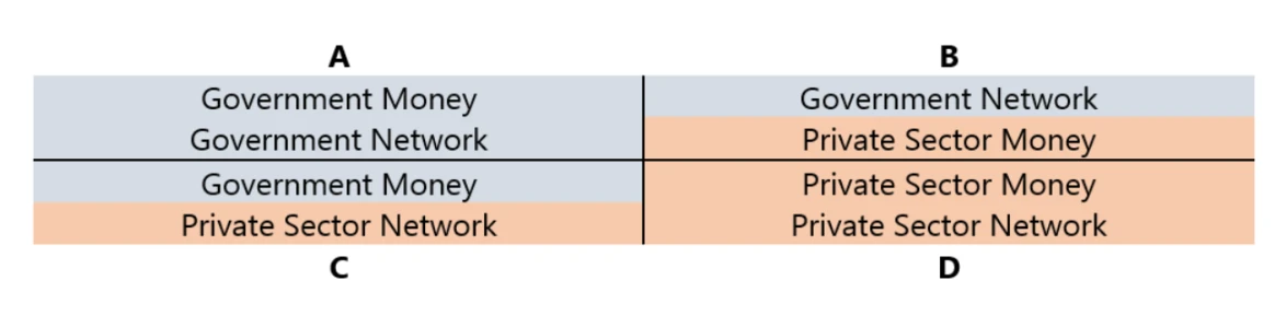 货币和支付网络可以是公共的,也可以是私有的。「公共」是指政府、中央银行和其他公共部门机构,而「私有」是指私人拥有和经营的实体,例如大多数商业银行、信用卡公司和其他金融服务提供商。在实践中,两者之间的界限并不像下图的象限中那样清晰,因为政府发行的公共货币在私人网络中流通,而许多私人金融部门受到公共机构的严格监管。然而,公私区别是思考新兴货币和支付系统与现有系统关系的一个很好的起点。