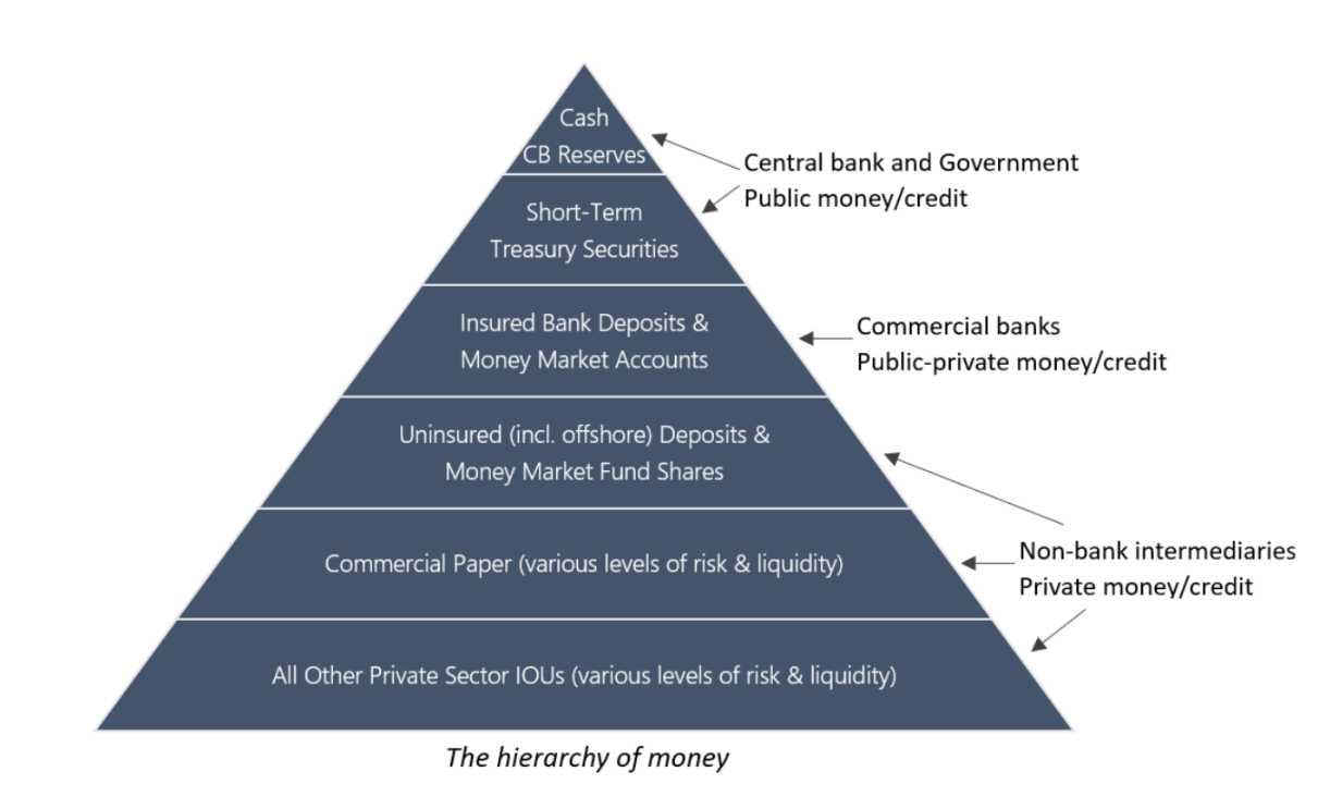 在第二种情况下,与国家货币相关的货币也可以采取更「公共」或更「私人」的形式。这可以通过经典的货币等级制度来说明,其中接受度和流动性从上到下依次降低:接受度和流动性最好的(公共)货币位于等级制度的顶端,而最差的(私人)货币则位于底部。虽然可能存在地区和历史差异,但下图大致反映了大多数现代经济体的状况,即发行货币的权利仅限于中央银行。而与该货币相关的货币单位则由商业银行、非银行金融中介机构和私营部门使用,用于计价信贷和证券,这些信贷和证券在不同程度上被视为现金等价物。