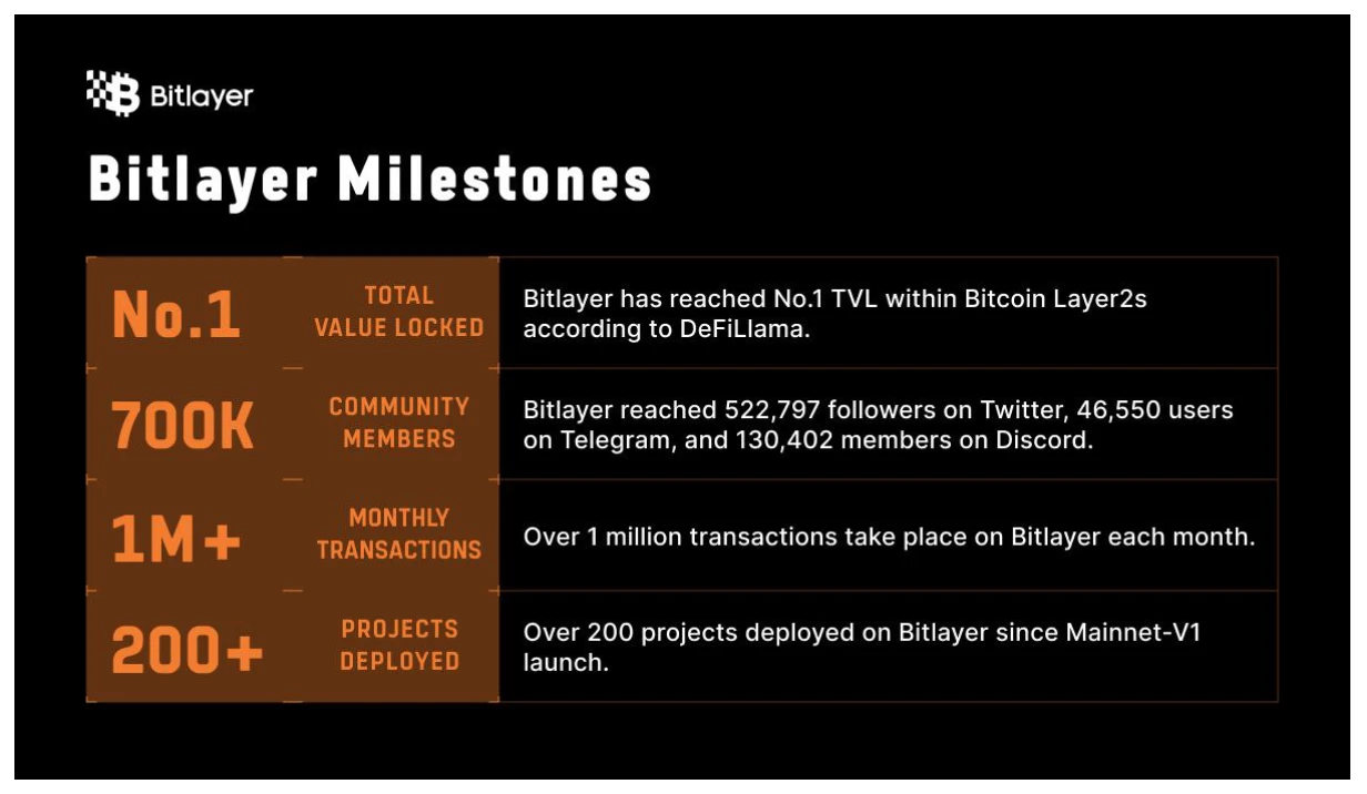 自团队成立以来,Bitlayer( https://www.bitlayer.org/ )致力于开发者部署、生态建设与用户获取。目前,Bitlayer 已实现数个里程碑,包括发布 Bitlayer 技术白皮书、启动开发者激励空投计划、上线 Mainnet-V1、推出 Dapp 榜单竞赛以及系列 Bitlayer 头矿节等,并取得了许多成果。
