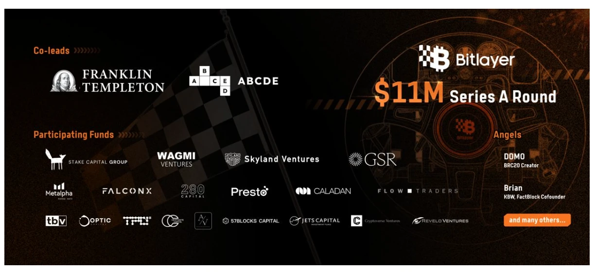 7 月 23 日,首个基于 BitVM 的比特币二层项目 Bitlayer 宣布完成 1100 万美元 A 轮融资 ,本轮融资由一线投资机构 Franklin Templeton Digital Assets 和 ABCDE Capital 联合领投,此前领投 Bitlayer 种子轮的 Framework Ventures 也继续参与本轮融资。
