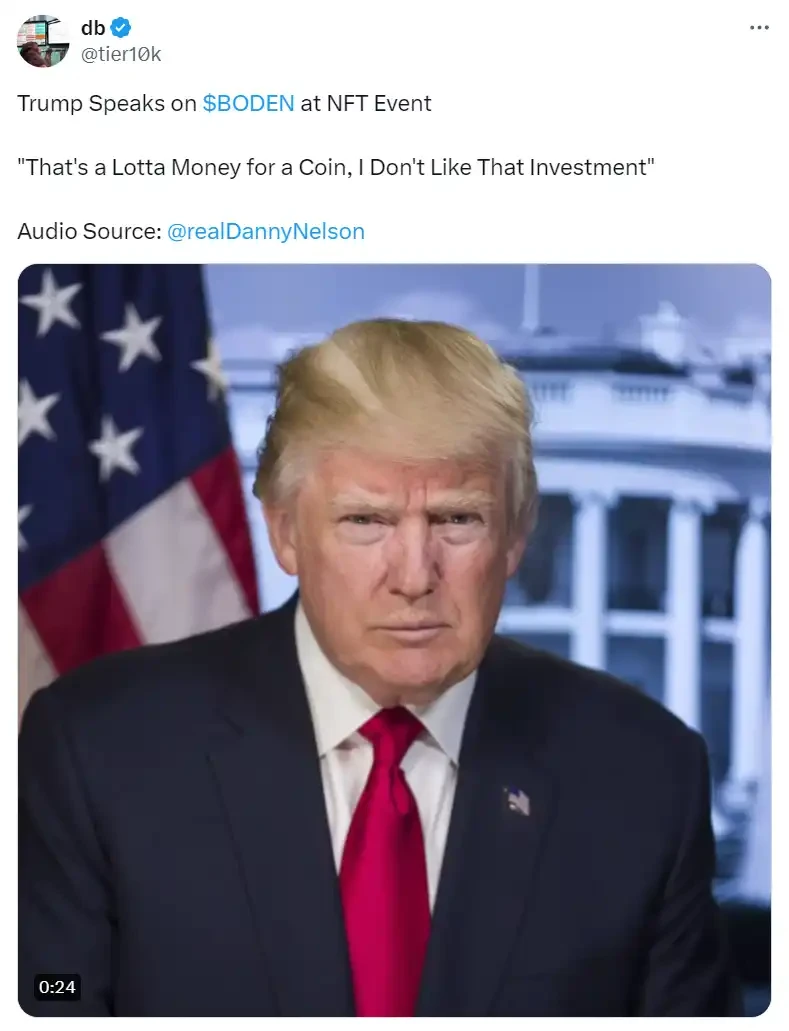 @tier 10 k 还提到,CoinDesk 记者 Danny Nelson 也参加了这次活动并录下了一段有趣的对话。在活动中,有人向川普提到了拜登概念 meme Token $BODEN 有了 2.4 亿美元的市值,川普听到后表示,「这对于一个币来说钱真挺多,我不喜欢这个投资」。