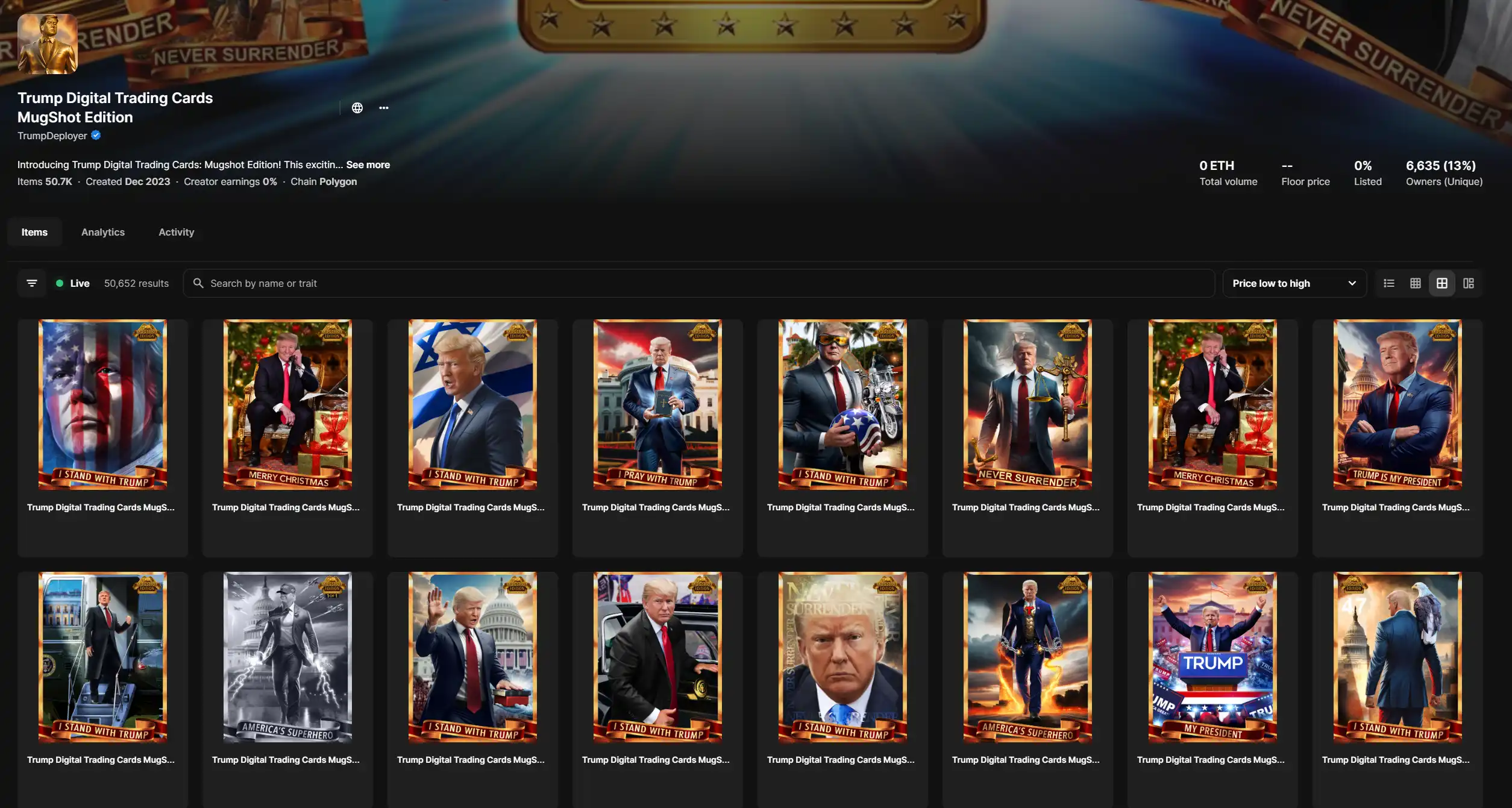 2023 年底,川普宣布了他的第三个 NFT 系列「Mugshot Edition」,每张售价 99 美元。购买超过 47 张「Mugshot Edition」的支持者就能够与川普在位于美国佛罗里达州的海湖庄园共进晚餐,还有机会获得一件川普于 2023 年被捕时所身穿的西装。