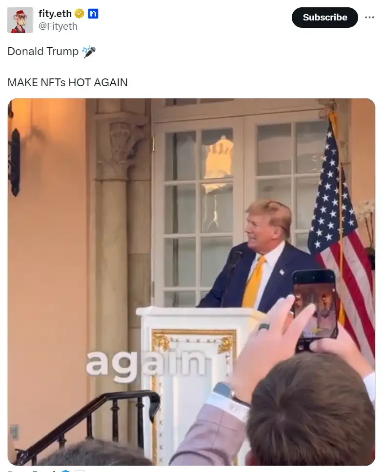 而在今年的 5 月,川普又在海湖庄园举行了一次「加密专场」。在这次的活动中,川普很自豪地宣称所有支持他的 NFT 玩家与他一起成功地「Make NFTs hot again」,因为「Mugshot Edition」的成功发行是在 NFT 熊市之中。