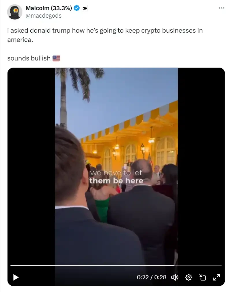 在 NFT 圈内,DeGods 的联合创始人 @frankdegods 也参与了本次活动。另一位来自 DeGods 的团队成员 @macdegods 则更为幸运,戴着圈内知名 meme Mog 的眼镜的他在台下举手,被川普成功「翻牌」,他问川普的问题是,许多美国 Crypto 企业因为监管原因离开美国,如何解决这样的情况。川普则回答,如果我们要拥抱加密,我们就必须让这些 Crypto 企业留在美国。