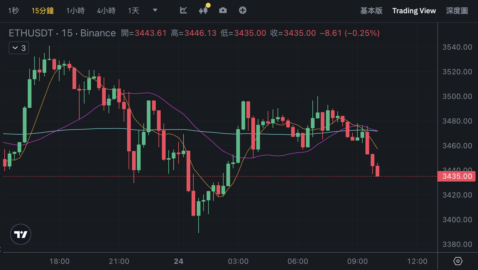 。截稿前有所回弹,但幅度不算大,现报 3,435 美元,近 24 小时下跌 1.39%。