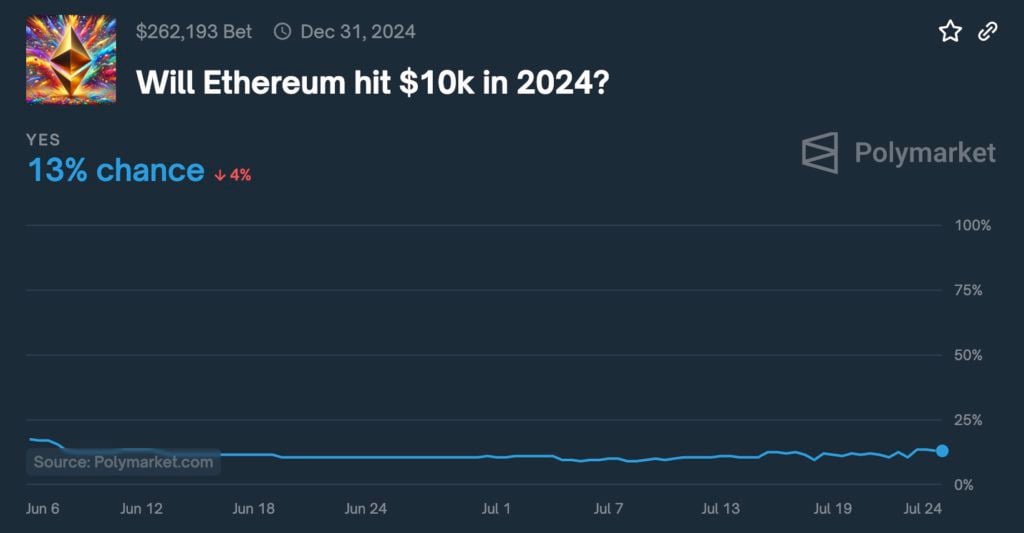 另一个规模较小的市场预测显示,ETH 今年有望突破 1 万美元的机率只有 13%。