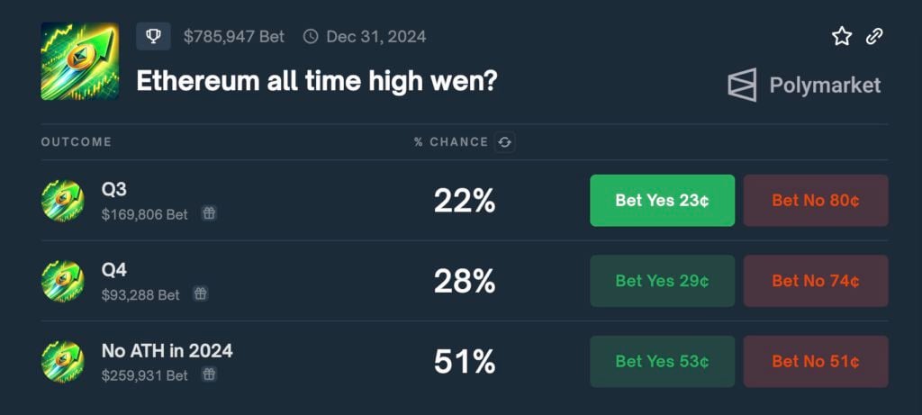 在预测市场 Polymarket 上,最大的一个市场投注额接近 78 万美元,其中有 51% 的用户认为「2024 年 ETH 不会出现 ATH」;约 28% 的用户预测,ETH 可能在第四季突破历史高点。