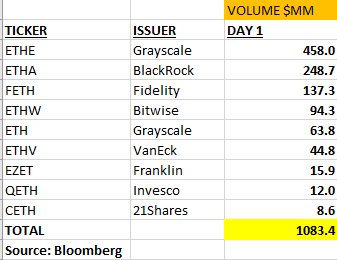 收盘后,以太坊现货 ETF 第一天的总交易量为 10 亿美元,是比特币现货 ETF 第一天交易量的 23%,彭博 ETF 分析师表示: