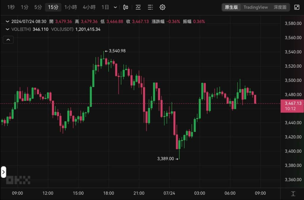以太坊的价格走势上,也没有庆祝行情。𫔭盘后持续下挫,接近一点左右更跌破 3,400 关卡,最低报 3,389 美元。截稿前有所回弹,但幅度不算大,现报 3,467 美元。
