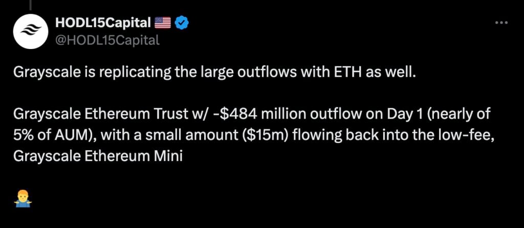 以 太坊现货 ETF 昨(23)日晚间正式上市交易,今晨收盘后各项交易数据也持续公布。根据 HODL15 Capital 监测 数据 ,灰度的以太坊基金 ETHE 第一天就流出 4.84 亿美元(接近 AUM 的 5%),其中少量(1,500 万美元)流入降低管理费用后的灰度以太坊迷你基金。
