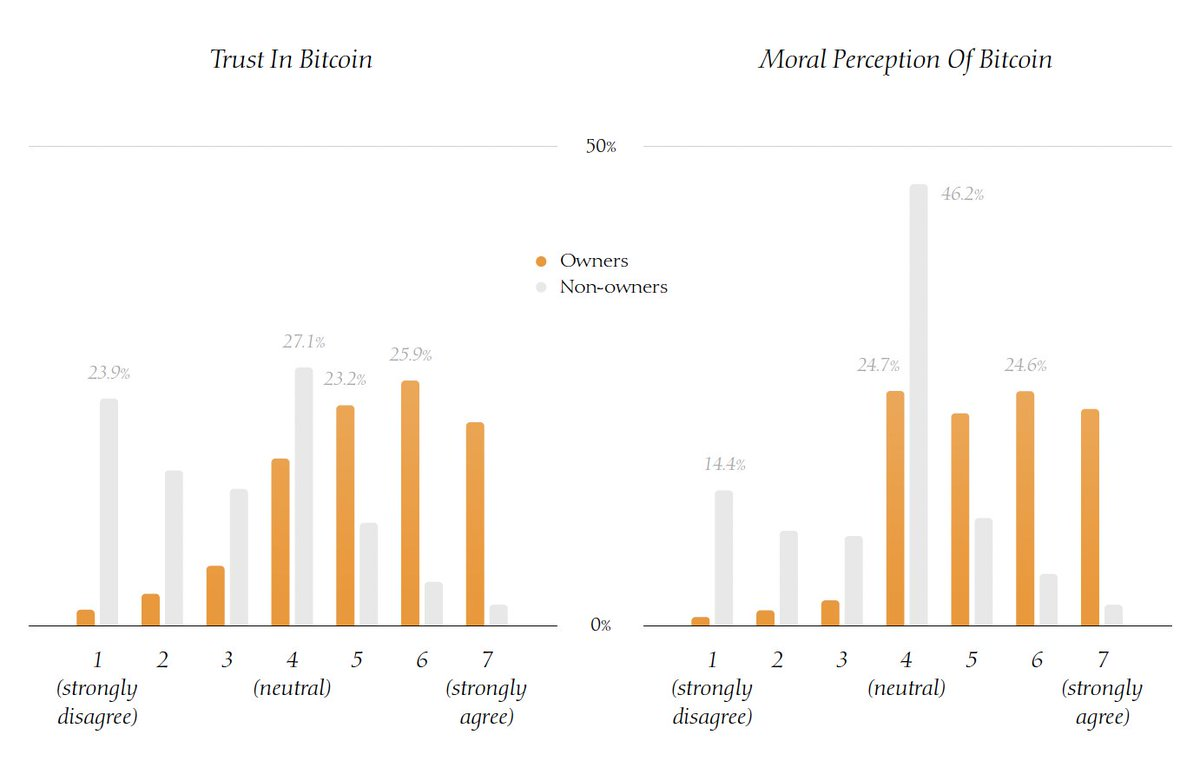 具体来看信任和感知的道德性,你可以清楚地看到持有比特币的人和不持有比特币的人之间的鲜明对比。