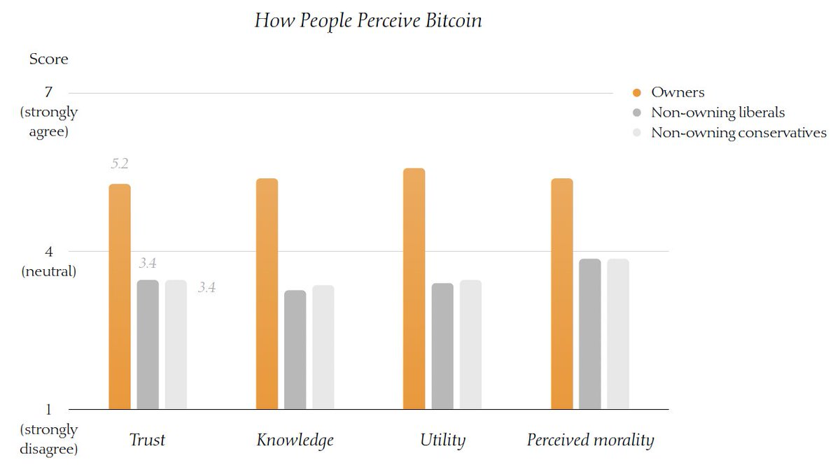 与比特币持有最强相关的不是你是谁,而是你对比特币了解多少,以及你是否认为它有用、值得信赖和好。