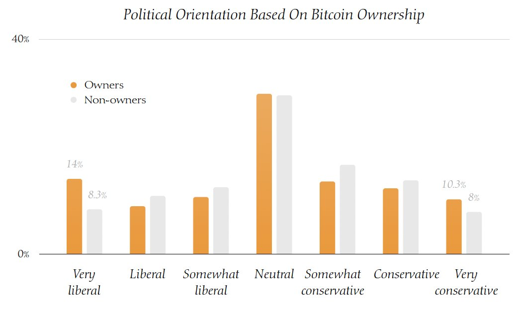 更奇怪的是,那些自我认同为“非常自由”或在 10 分制中将自己定位在最左边的人,相对于其他政治身份,最有可能持有比特币。