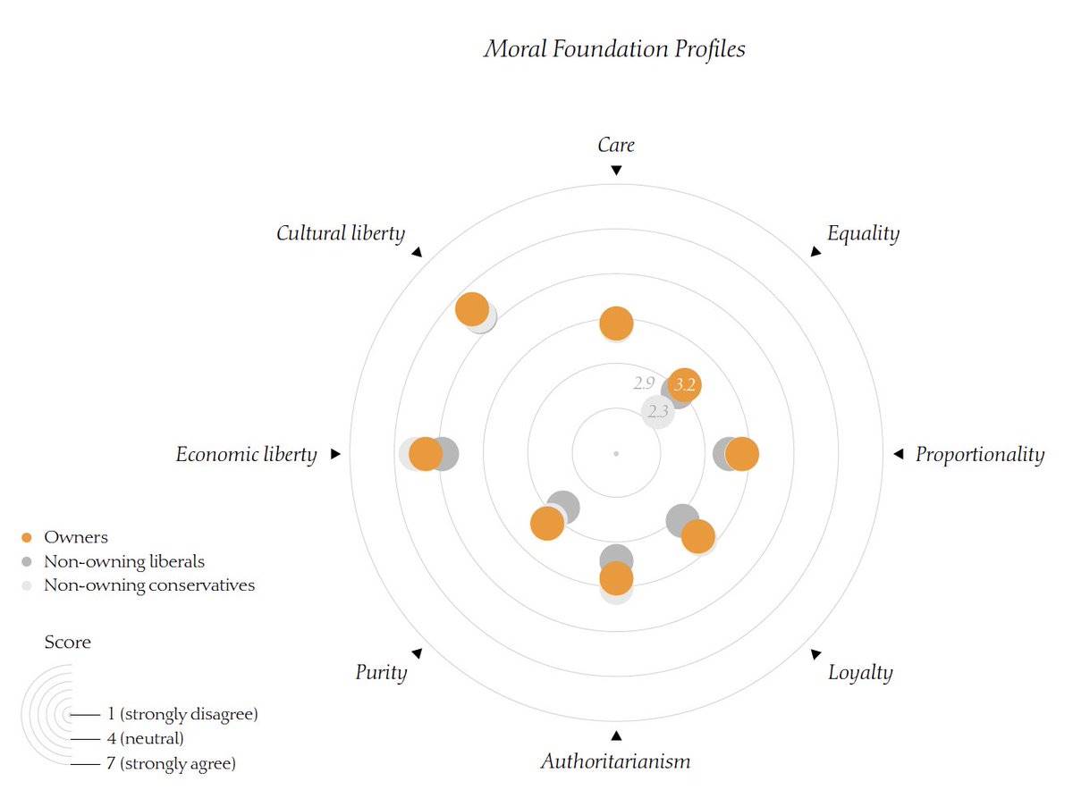 在“道德基础”方面,我们知道自由派和保守派有不同的价值观。例如,自由派更重视“关怀”,而保守派更重视“忠诚”。我们想看看比特币持有者更倾向于哪一方。结果发现两者兼具。