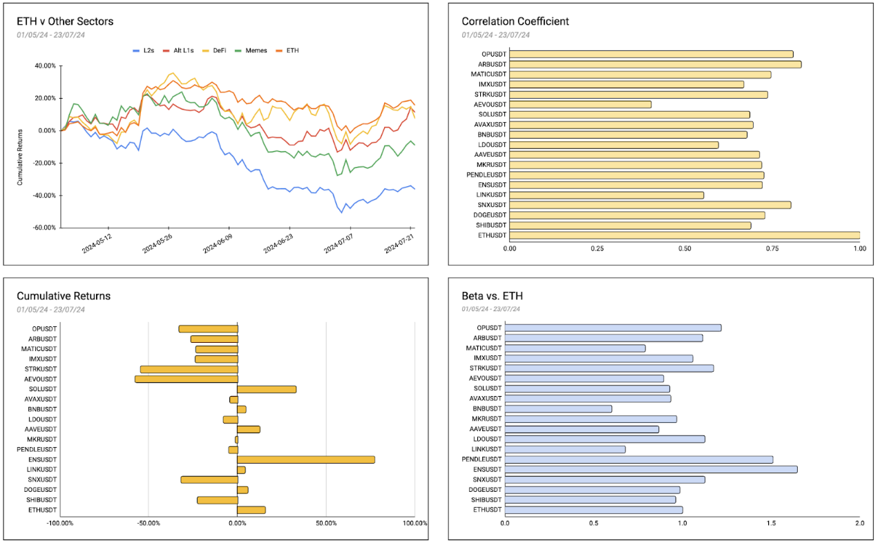 围绕多头 ETH beta(指以太坊生态内的山寨币)交易的讨论有很多,多数人认为,随着 ETH ETF 的顺利通过,ETH 将再次上涨,进而打开 ETH beta 的上涨空间。虽然这是一个合乎逻辑想法,但数据是否支持这一观点?