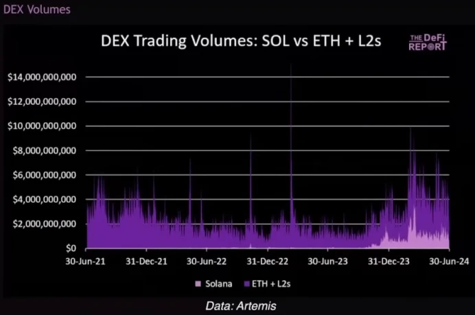 Ryan: 让我们转到第三个基本面指标,即 DEX 交易量。我们正在查看 Solana 与以太坊及其二层的 DEX 交易量。 Solana 的 DEX 交易量非常可观,在第二季度达到了 1080 亿美元,占以太坊及二层的 36% 。这与上一个周期 Solana 的交易量几乎为零形成了鲜明对比。你如何看待这个图表?