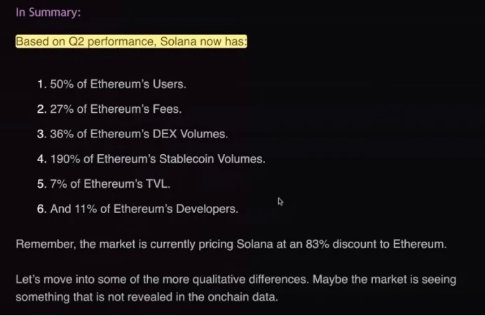 Ryan: 我之所以从这些问题开始,是为了帮助我们的听众了解你对资产和投资方法的看法。这个框架对我们的对话很有价值。你上周发布了一份报告,引起了我的注意。这是一个很好的话题,我们可以将基本面分析应用于以太坊和索拉纳(Solana)这两种在本轮周期中获得大量关注的资产。 你的报告标题“索拉纳是否应该比以太坊折价 83% ”引起了我的兴趣。你是从市值的角度来看待这个问题的,目前索拉纳的交易价格确实比以太坊低了 83% 。 它应该如此吗?这是一项数据驱动的调查,我很欣赏你客观、以数据为中心的观点。