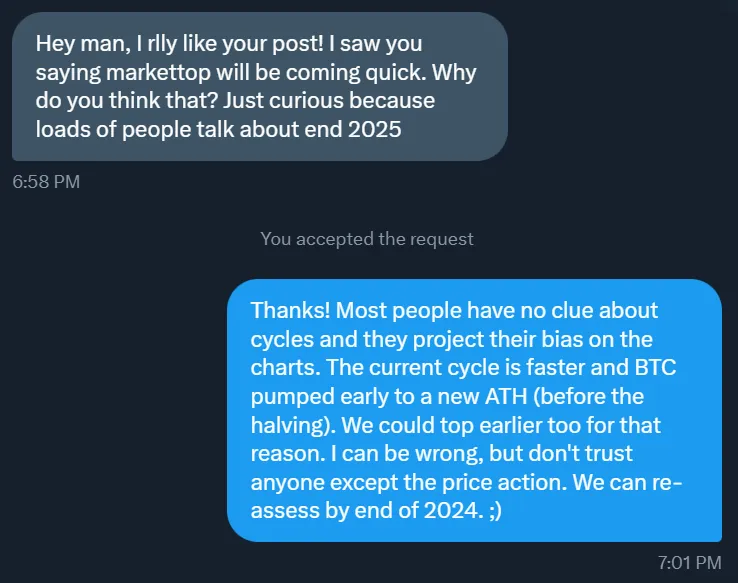 谢谢!大多数人对市场周期没有概念,他们只是把自己的偏见映射到图表上。当前的周期更快,BTC 提前在减半之前就达到了新的历史高点。所以我们也可能会更早见顶。当然,我也可能会错,但除了价格走势,不要轻信任何人。我们可以在 2024 年底再评估一下。;)