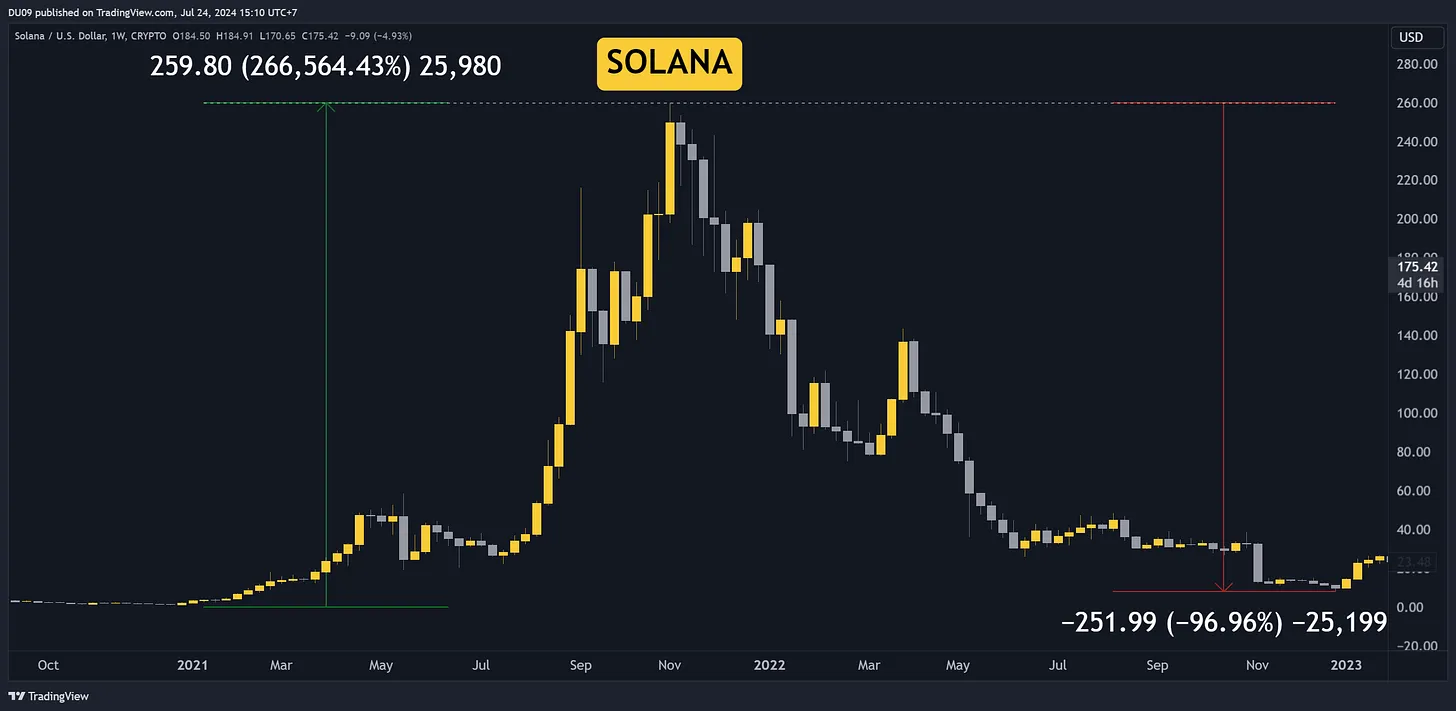 现在每个人都喜欢 Solana,但看看上一个熊市对其价格的影响! 99% 的山寨币在下一个熊市来临时都会像这样。不要指望情况会有所不同。相反,要为这种情况做好计划。