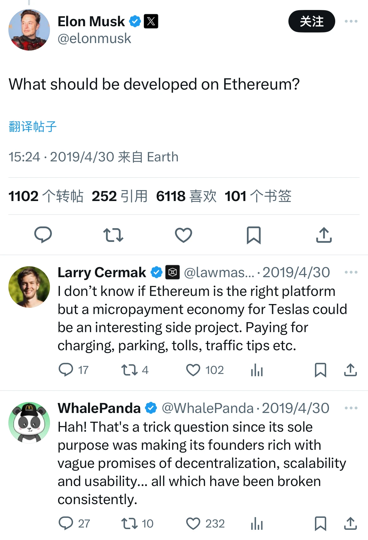 当天晚些时候,他 再度发文 提问:“应该在以太坊上面开发些什么?”评论区的 2 个高赞回答也代表了彼时人们对加密货币截然不同的态度:一种观点认为,不知道以太坊是否是一个合适的平台,但或许特斯拉的微支付经济可能是一个有趣的子项目;另外一种观点则认为,以太坊唯一的作用就是打着去中心化的幌子让创始人们一夜暴富。