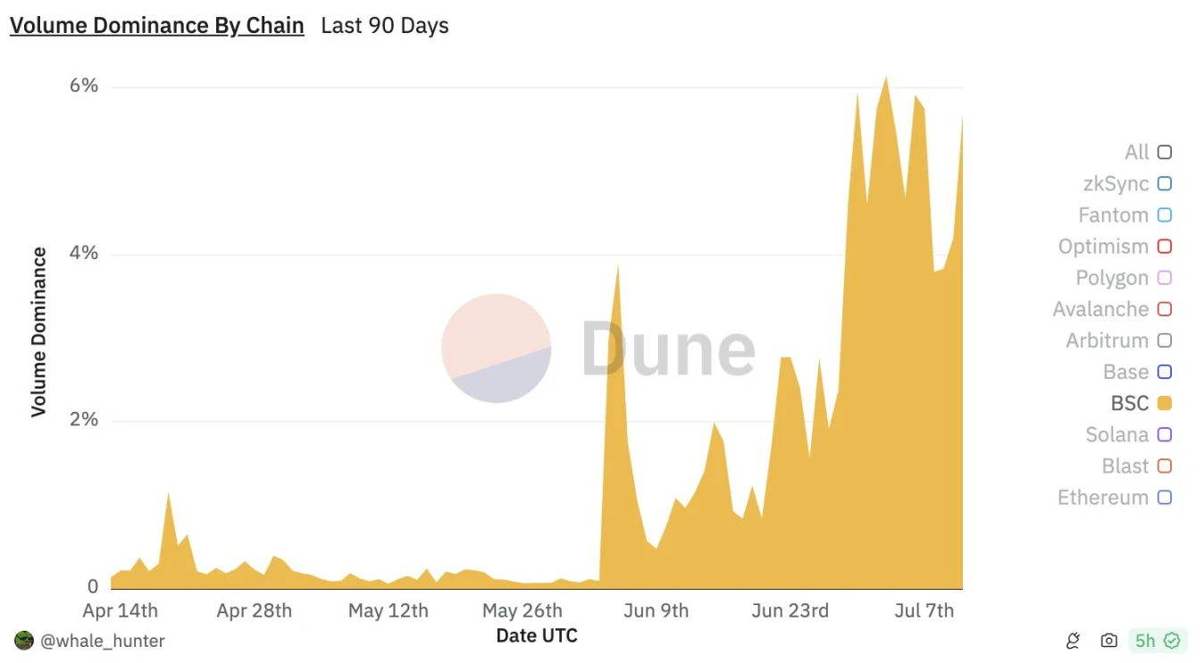 几周前,美国一名法官驳回了对 CZ 的指控。预计 CZ 将在未来几个月内回归,此外,自 6 月以来,BNB Chian 的交易量和占比一直在稳步增长。