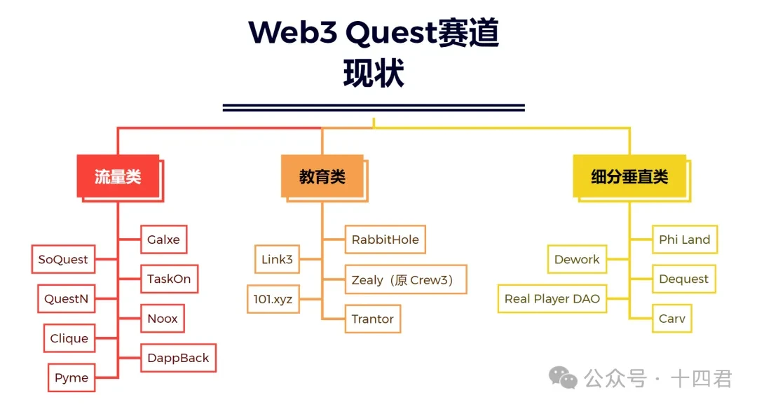 Web3任务平台的营销需求推动了平台的快速发展,可分为三类:流量类(如 Galxe、SoQuest、TaskOn)、教育类(如 Layer 3、RabbitHole)和垂直细分类(如 Phi Land 和 Dework)。更多的可以看下面表中所列举的。