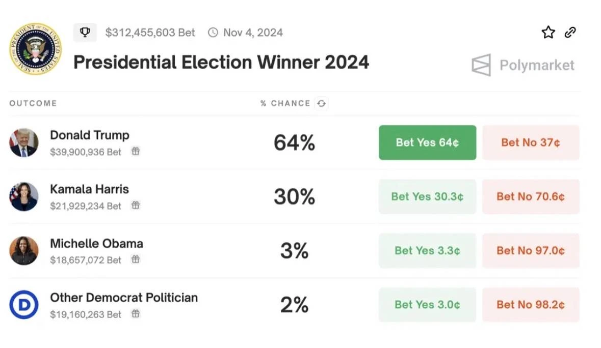 V神长期以来一直看好预测市场在扩展加密货币日常应用方面的潜力,曾多次公开提起,他投资的 Polymarket 今年也因选举话题而大火出圈。选举投注这一动作可以说是历史悠久,早在中世纪时,人们就开始在教皇选举中进行押注。到今天,特朗普和众民主党候选人的对战也吸引了大量民众的注意力。但由于美国明令禁止政治事件的投注,此类活动就聚焦到了类似 Polymarket 这样的加密市场。它的实时结果反映了用户真实想法,而大众情绪往往也会被当作我们交易参考的重要因素,预测赛道正在以一种独特的方法走入大众视野。
