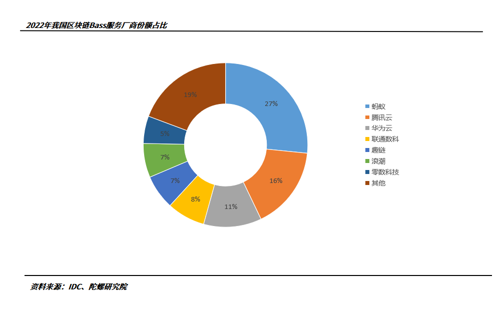 发展至今,我国互联网大厂也占据着区块链产业的第一梯队,覆盖了从基础设施到产品应用乃至拓展服务的所有类别,BaaS平台服务端更是众多大厂区块链发力的关键区域。2022年,中国区块链 BaaS厂商市场份额被七家单位瓜分,分别为蚂蚁(26.6%)、腾讯云(16.3%)、 华为云(11.4%)、联通数科(7.5%)、趣链(6.8%)、浪潮(6.7%)以及零数科技(5.4%),七家份额占比高达80.7%。