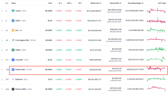 在丰厚蛋糕的吸引下,近年来也有诸多知名机构进入稳定币领域,但多折戟而归。核心原因就是稳定币的头部效应太过突出,在稳定币市场,三大稳定币盘踞份额的90%,尤其是USDT,几乎呈现出一家独大的局面,在1600亿美元的总市值中有超过1100亿元为USDT。以全球知名支付巨头Paypal为例,虽支付用户量与品牌知名度均位于翘楚,但其去年8月发行的稳定币PYUSD却不温不火,发行总量仅有3.49亿美元,然而,其已位于稳定币领域第七位。