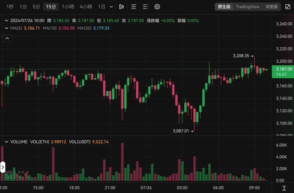 即时数据显示,以太坊今晨一度下探 3,087 美元,撰稿当下虽回弹到 3,187 美元,但近 24 小时仍下跌 1.75%;且同时间内比特币的回弹显得强势许多。