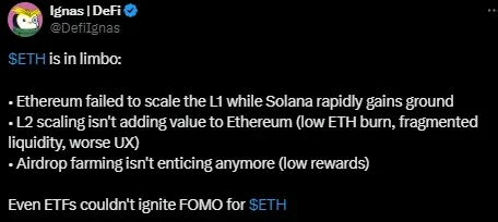 我认为,ETH 目前表现不如 BTC 的主要有两个原因: