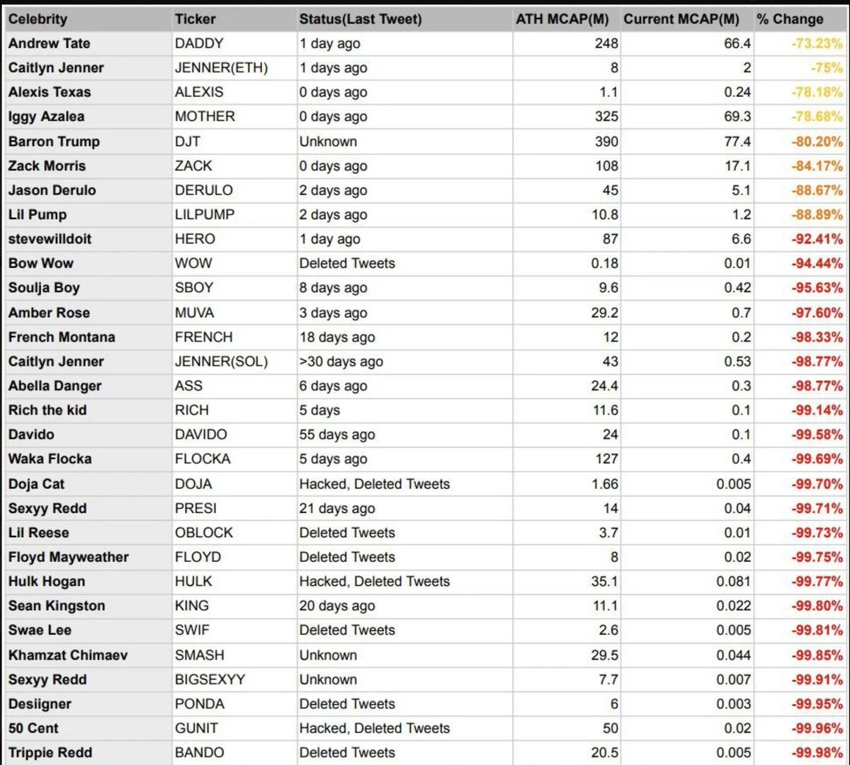 根据加密 KOL Slorg 的统计,市面上有一定关注度的 30 多个名人概念 Meme 币市值在短短几天到几十天不等,市值下跌至少 80% 左右。而 pump.fun 则为这些名人币提供了最为便利的工具,一定程度上成为“名人币收割”的“帮凶”。