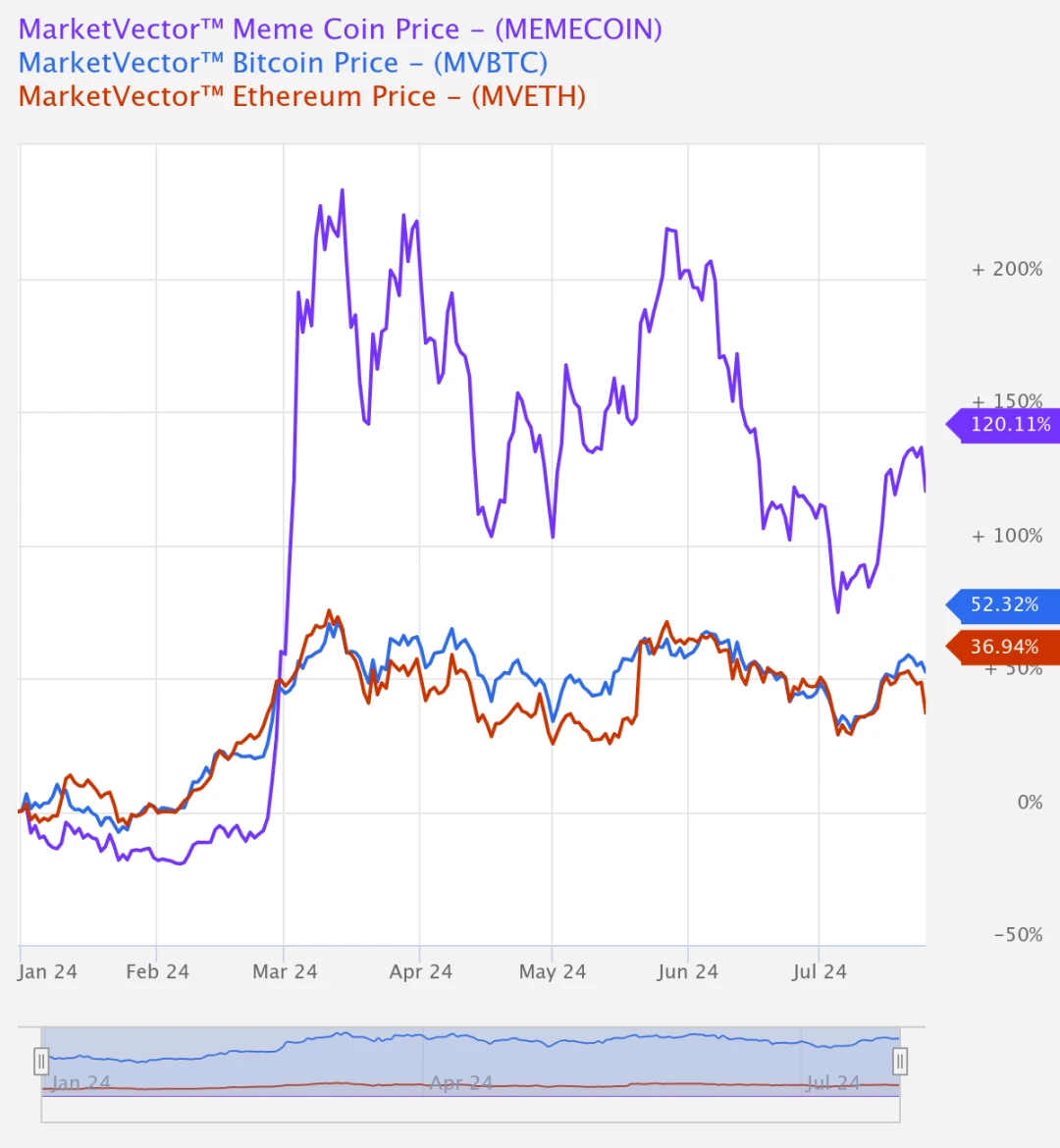MarketVector 推出的 Meme Coin Index,追踪市值最大的 6 种 Meme 代币的回报率表现。
