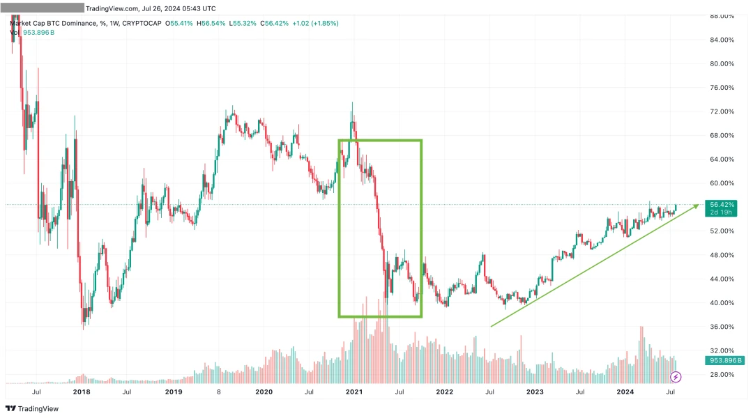 目前还是处在比特币季,该指数从今年初以来一直在上升,截止 7 月 26 日 56% ,山寨币的表现仍不及比特币,所以比特币占主导地位。
