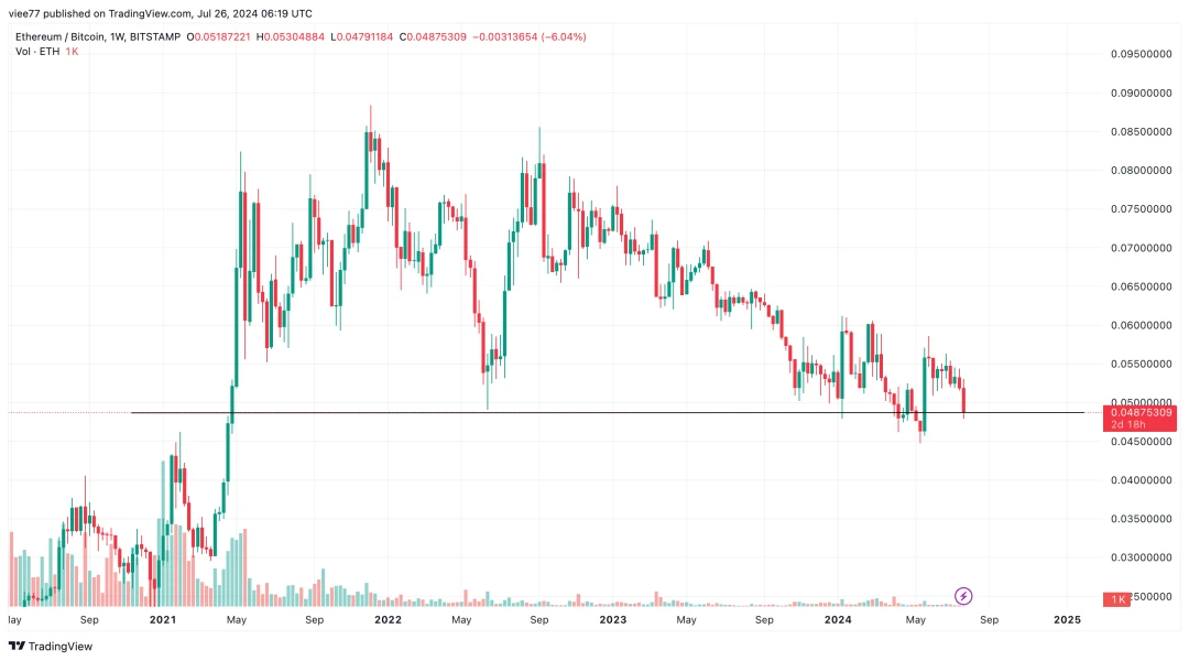 ETH 在本阶段落后于 BTC:ETH/BTC 汇率