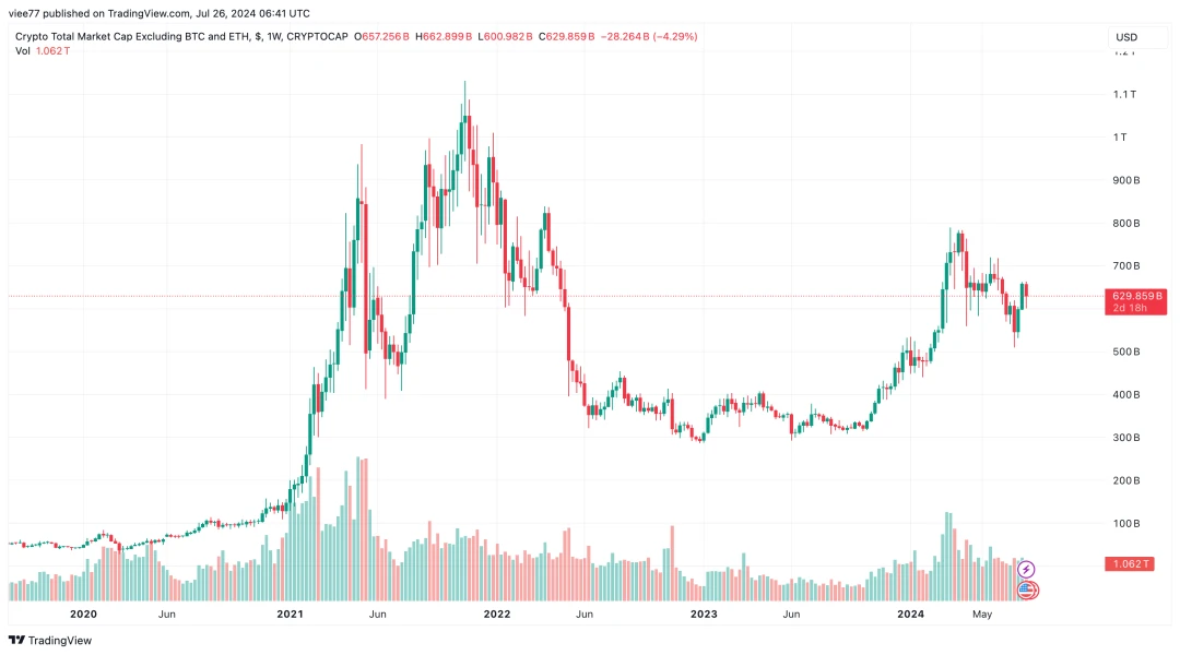 该指标全称是 Crypto Total Market Cap Excluding BTC & ETH,除了 BTC、ETH 以外,加密市场其他代币总市值大小,反映了资金本身流入山寨币市场的整体情况。