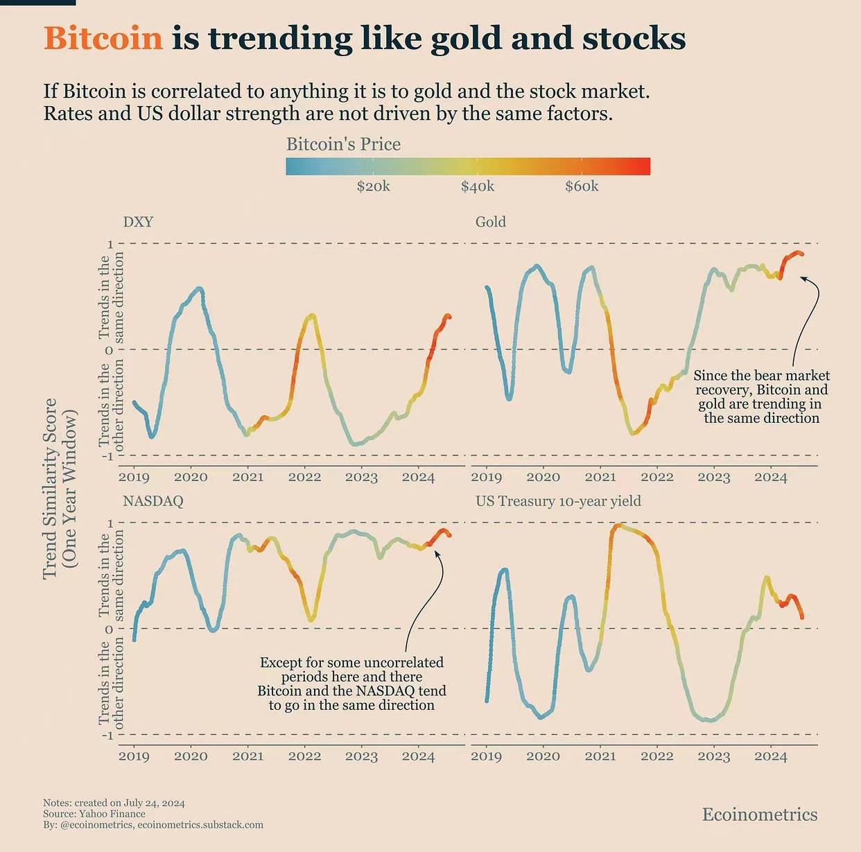 所以今天,我决定调整一些参数,研究比特币与几个“宏观”资产在 1 年滚动窗口内的趋势相似性得分的变化。