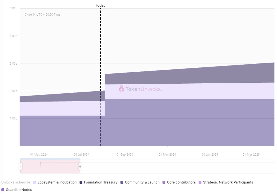 W 迎来上线以来首次 Cliff 解锁,当前流通量占总量的 20% ,本轮解锁 6 亿枚面向社区解锁,价值约 1.74 亿美元,剩余部分为线性解锁。