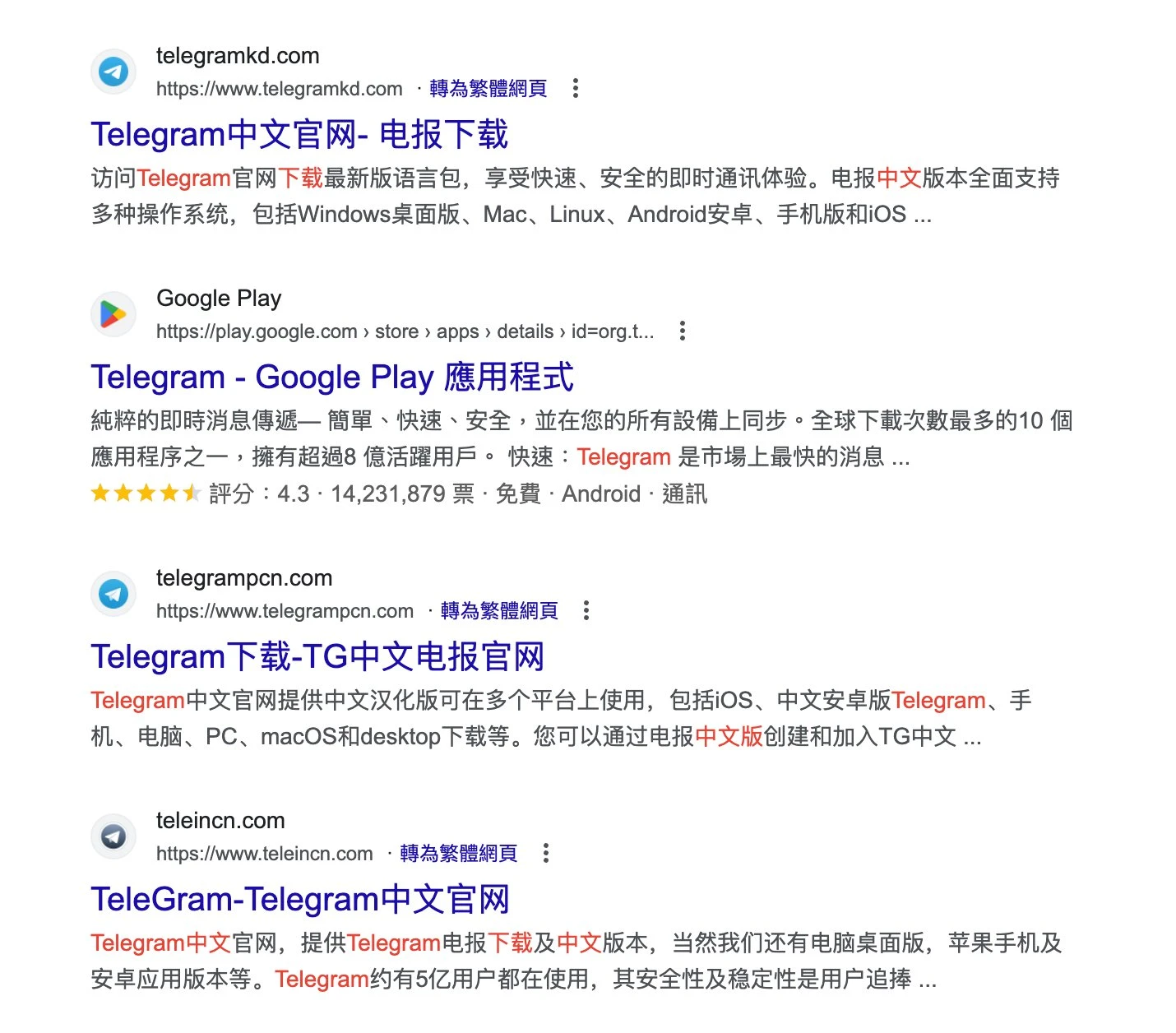 甚至谷歌搜索都不安全,特别是搜索「Telegram 中文版」,前几个都不是官网。