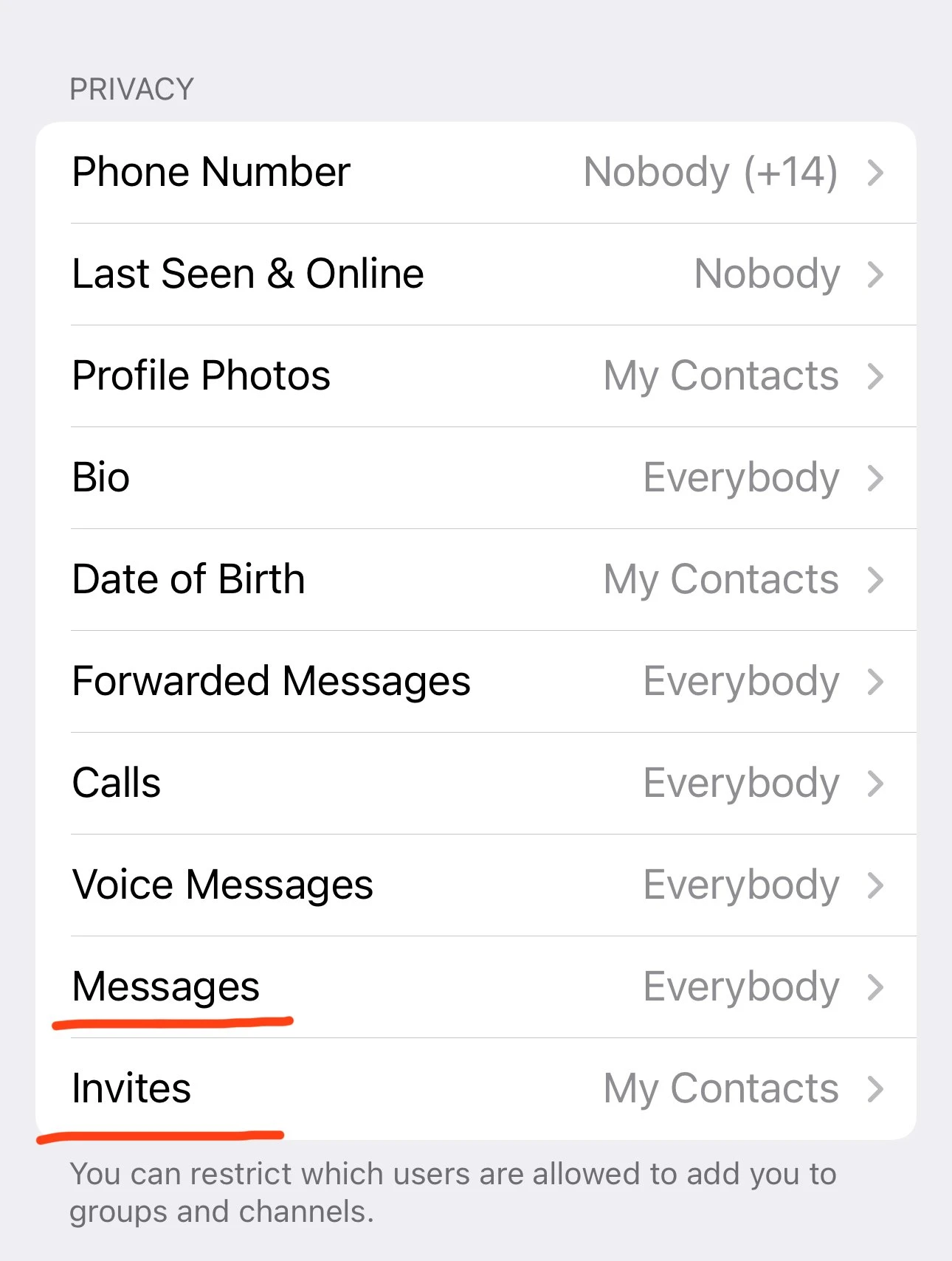 使用 Telegram 的默认设置,很容易被各种骚扰,并且存在安全隐患。接下来你需要做几个很重要的设置: