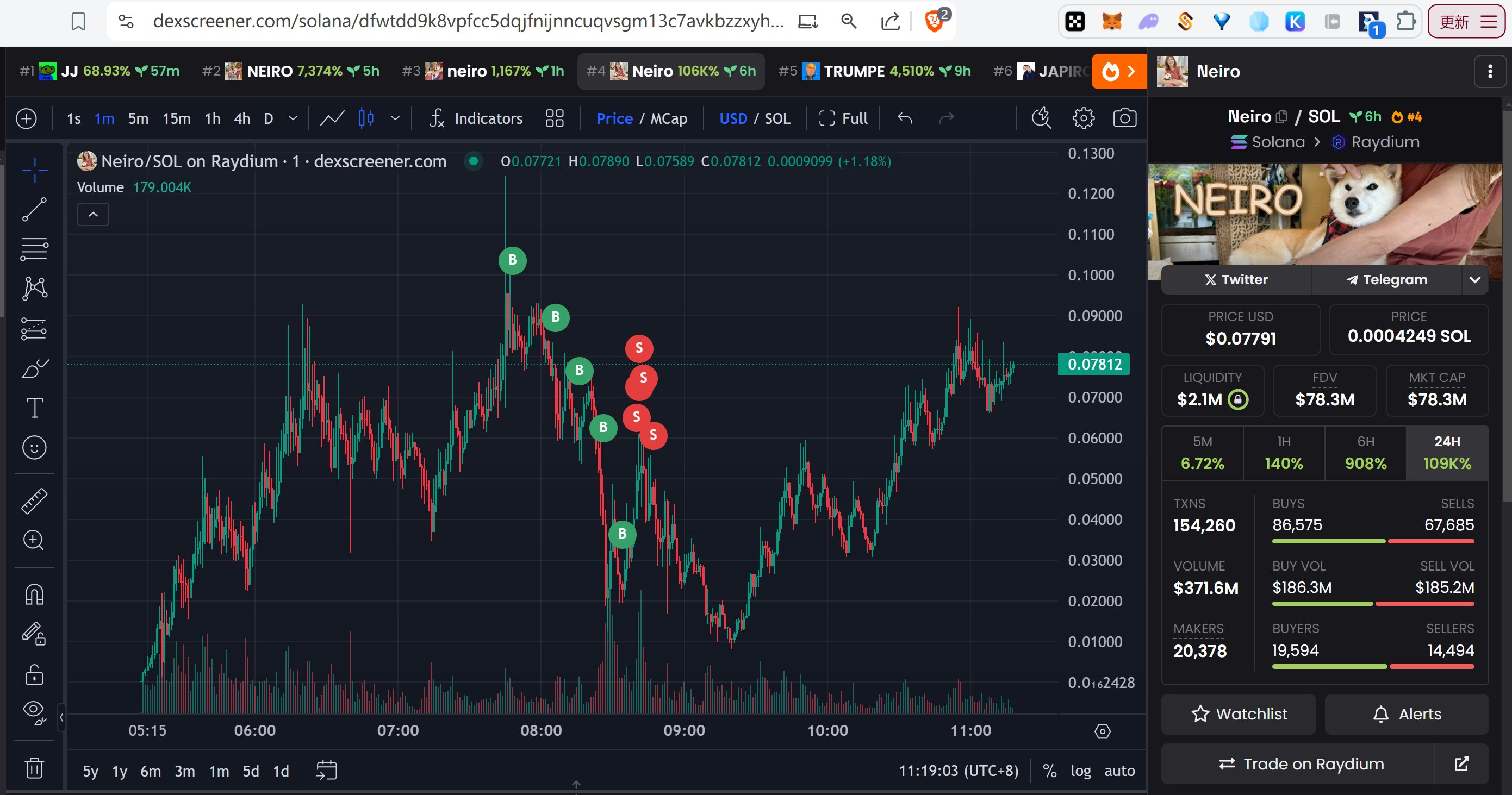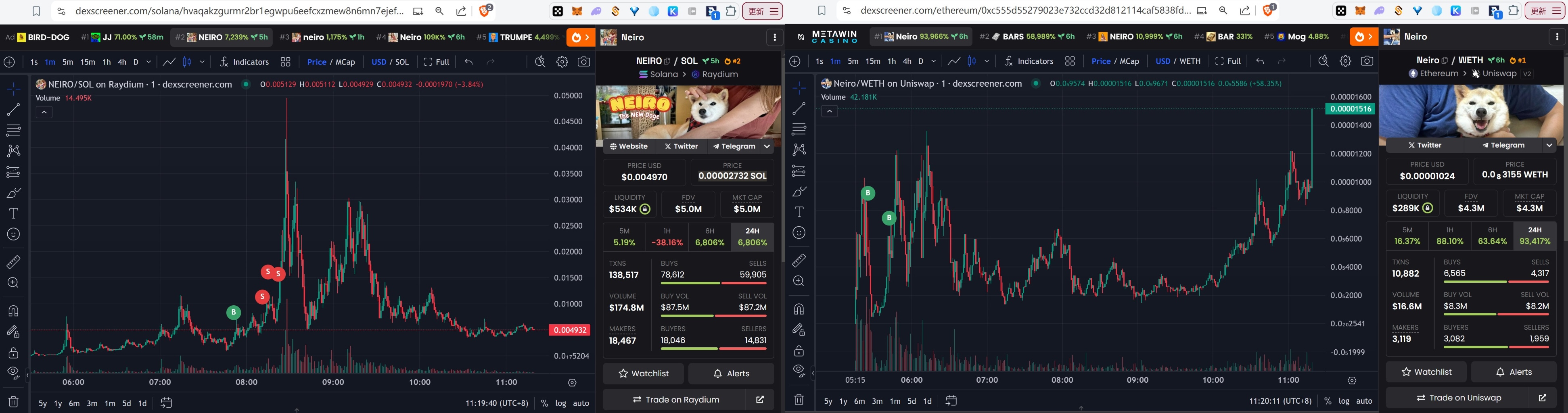 按往常来说这种币我至少也会买个 20SOL 防个身,因为属于一个不错的叙事最先跑出来的龙头,但是昨晚被特朗普相关的 PumpFun 搞得眼花缭乱,而且大部分都没有超过 1M,让我有些不太想操作,又另外搜了一下发现 Neiro 相关新闻是半小时前出来的,这两个因素叠加之下我居然没有买,又去看了一会儿其他的币,再回过头来已经快 3M 了,我更不想追高了,于是眼睁睁看着$Neiro 在 25 分钟内涨到了 45M,也是我为什么发了上一条推表示很郁闷。