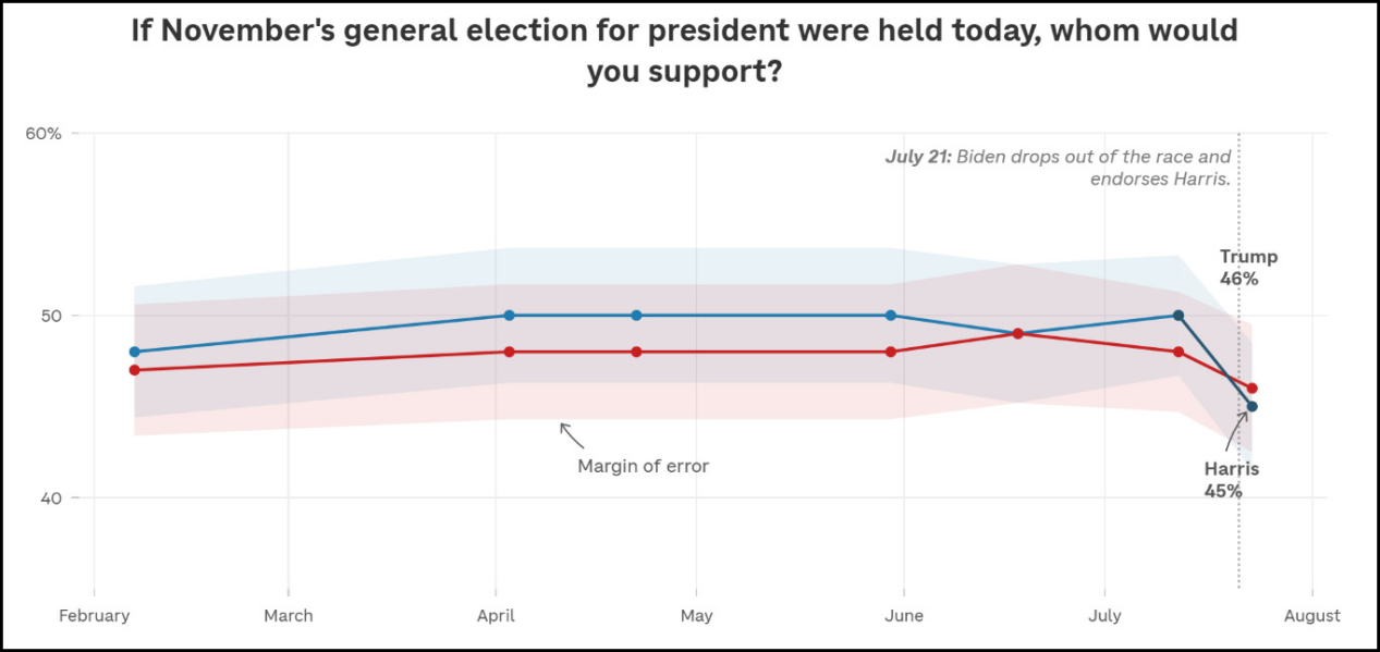 随着拜登宣布退选、卡玛拉·哈里斯(Kamala Harris)成为民主党可能的候选人,选情变得更加复杂。近一两年来,美国种族矛盾激增,哈里斯作为非裔和印度裔混血女性,代表了多元化和包容性,可能吸引大量少数族裔和女性选民。最新民调显示,哈里斯的支持率略高于特朗普,这意味着选举结果远未可知。