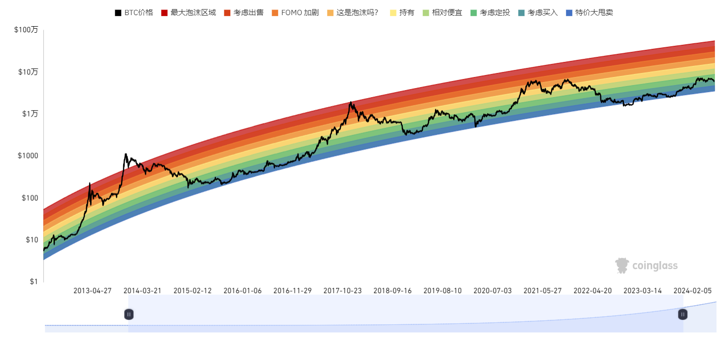 3)彩虹图(Bitcoin Rainbow Chart):这是一种长期趋势指标,将比特币价格划分为不同颜色区域,反映市场的整体情绪状态。